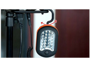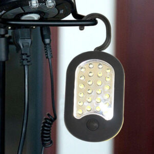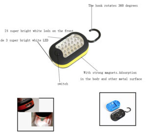 - 24 super bright white LEDs on the front and 3 super bright white LEDs on the side. On the back is a strong magnet and a hook. The strong magnet can be used on the metal body. The hook can be used for 360 degree rotation suspension.